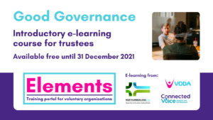 Funded by the National Lottery Community Fund, Elements Training Portal has been developed by Connected Voice, North Tyneside VODA and Northumberland CVA, who have been working in partnership since 2019 to help trustees overcome challenges such as capacity and geography by giving them the opportunity to access quality e-learning 24/7 from wherever they have an internet connection.