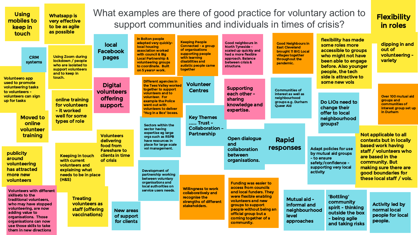 - A greater willingness for collaboration between voluntary organisations to share volunteers and share resources to support volunteers. For example, organisations such as RSPB and RVS have resources in place for management of large numbers of volunteers. Additionally, there was greater collaboration between the VCSE sector and public sector agencies (such as the police working alongside volunteers in Tees Valley)