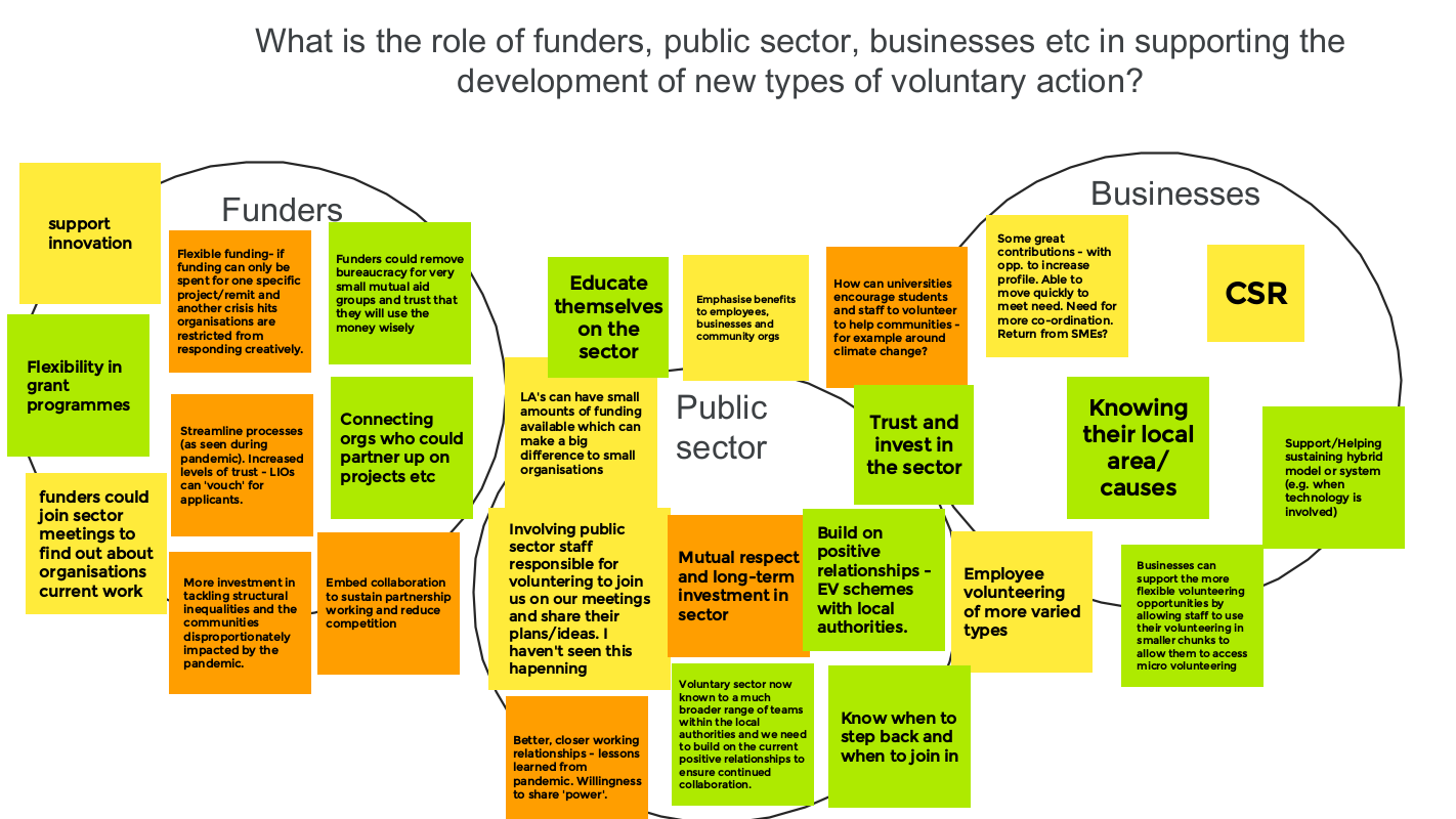 - What is the role of funders, public sector, businesses etc. in supporting the development of new types of voluntary action?